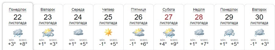 22 листопада: протягом дня триматиметься хмарна погода. Вранці синоптики прогнозують дрібний дощ, який повинен закінчитися до середини дня, проте ввечері він розпочнеться знову. Температура повітря коливатиметься від +3 вночі до +9 вдень.