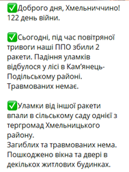 Жителі Хмельниччини теж відчули наслідки війни. У суботу на території області сили ППО збили дві ракети. Як повідомив начальник обласної військової адміністрації Сергій Гамалій у своєму телеграм-каналі, уламки однієї ракети впали у лісі в Кам'янець-Подільському районі, іншої — у саду Хмельницького району.