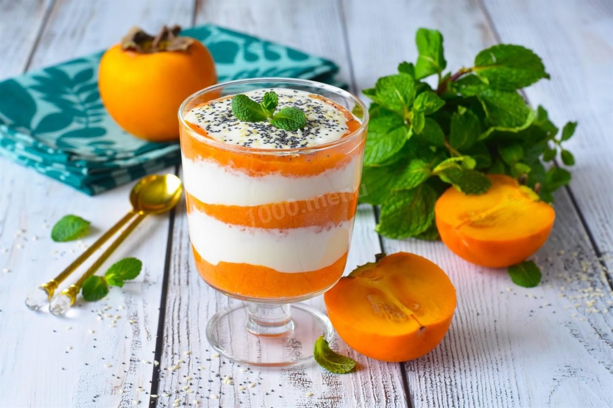 - У склянки вилити сирну суміш і викласти хурму. Перед подачею можна прикрасити листочками м’яти або кондитерською посипкою.