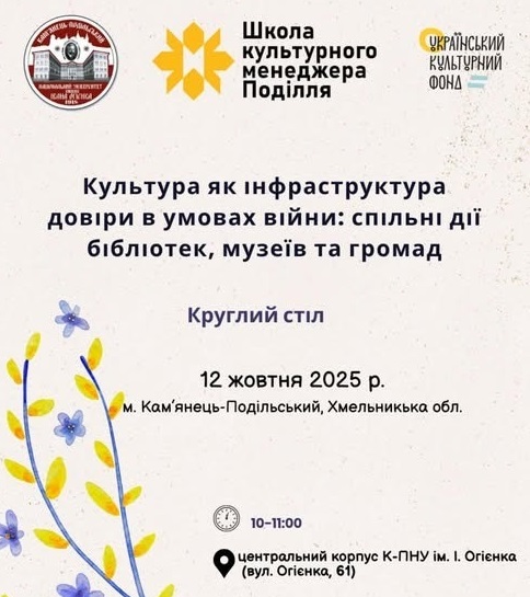 У Кам’янці-Подільському відбудеться круглий стіл від «Школи культурного менеджера Поділля». Учасники говоритимуть про те, як культура допомагає громадам зміцнювати довіру, розвивати партнерства й втілювати сталі проєкти навіть у час війни.