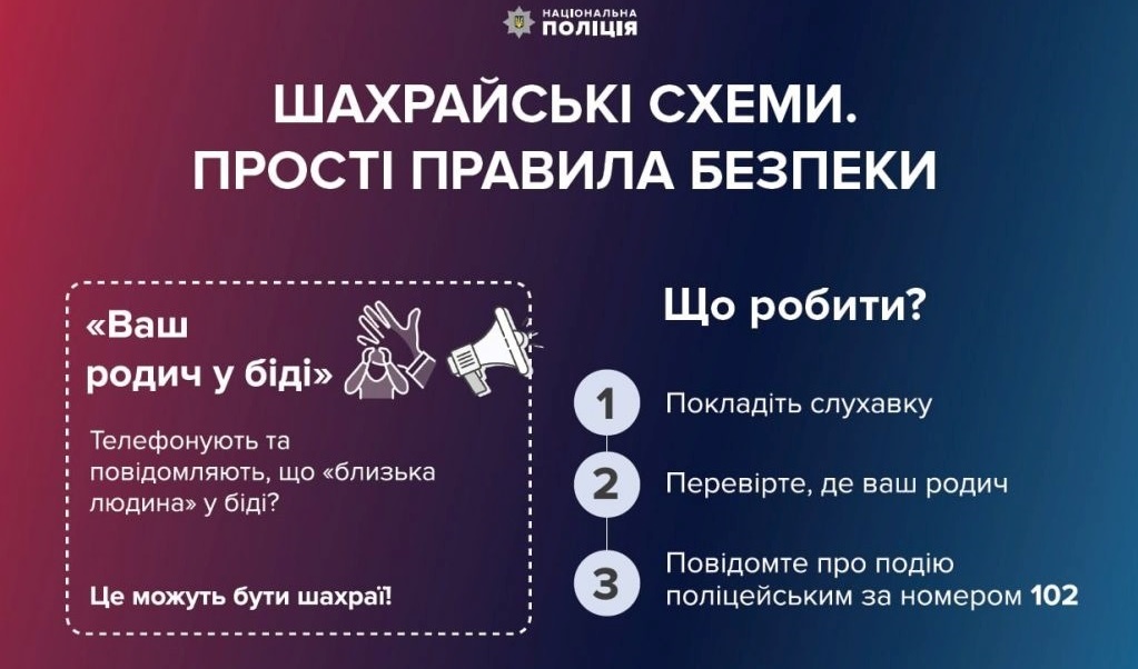 — Шахраї часто користуються емоціями жертв — страхом, тривогою чи співчуттям, аби змусити діяти поспіхом, — каже начальник відділу поліцейської діяльності №1 Юрій Краковецький. — Якщо вам телефонують і повідомляють про «проблеми з родичами», «слідство» чи «нещасні випадки» — перевіряйте інформацію самостійно та негайно телефонуйте на лінію 102.