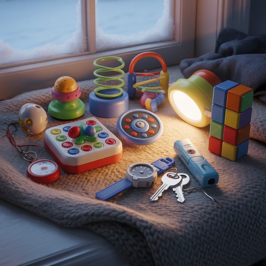 Альтернатива іграшкам. Часто іграшки, які малюк хоче взяти в подорож, дуже великі, тому краще обирати компактніші та зручніші іграшки або шукати цікаві речі, що зможуть замінити дитині бажаного трансформера та ін. Наприклад, музичні іграшки, головоломки на зразок «змійки», іграшки-шнурівки, імпровізоване кермо, ліхтарик, годинник, і навіть ключі.