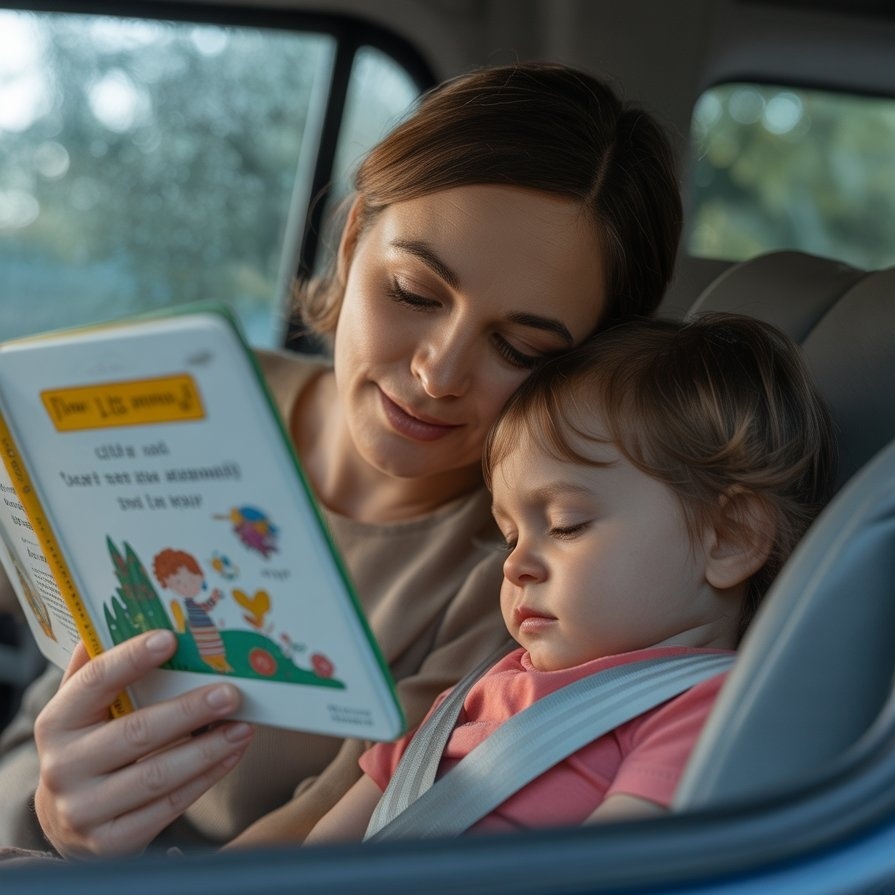 Вірші, пісні, приказки допоможуть вам у дорозі. Будь-яка мама має у своєму арсеналі кілька завчених дитячих віршиків. Перед поїздкою можна вивчити декілька нових або прихопити із собою книгу з поезією для малят. Окрім того, відомо, що римовані рядки швидше присипають дитину.