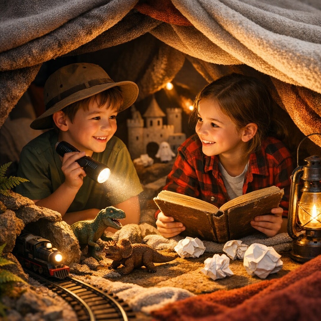 Перетворіть звичайну ковдру на таємничу печеру для динозаврів або тунель для поїзда. Посвітіть ліхтариком, створюючи атмосферу справжньої пригоди. Старші діти можуть будувати фортеці та влаштовувати битви паперовими м'ячиками.