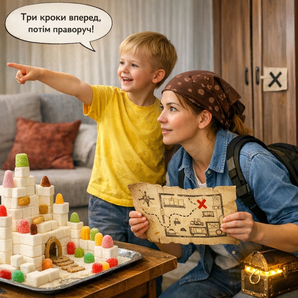 Граємо в хованки по-новому: малюк підказує, де захована іграшка («три кроки вперед, потім праворуч, біля шафи...»), а дорослий шукає. Можна навіть намалювати справжню карту кімнати із позначкою скарбу.