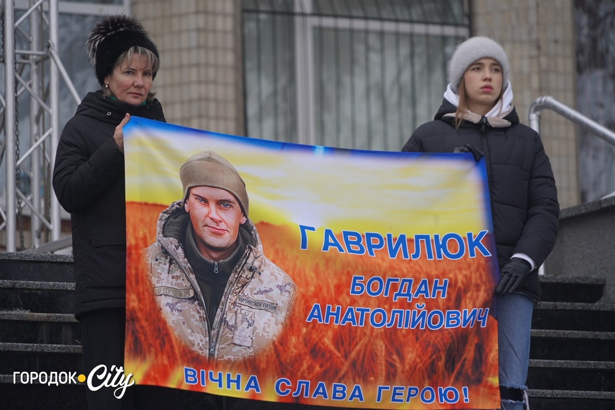 На центральній площі Городка цього дня майоріли прапори з портретами полеглих захисників — мов тихі сторожі пам’яті, що дивилися в очі кожному, хто зупинявся. Поруч — розгорнутий державний стяг України, як знак єдності та вдячності. Із мікрофона лунали імена, дати, уривки життєвих історій Богдана Гаврилюка та Андрія Огороднічука: спогади про дитинство, шлях у військо, останній бій. Люди слухали мовчки, аби зберегти ці історії — як частину спільної пам’яті громади.