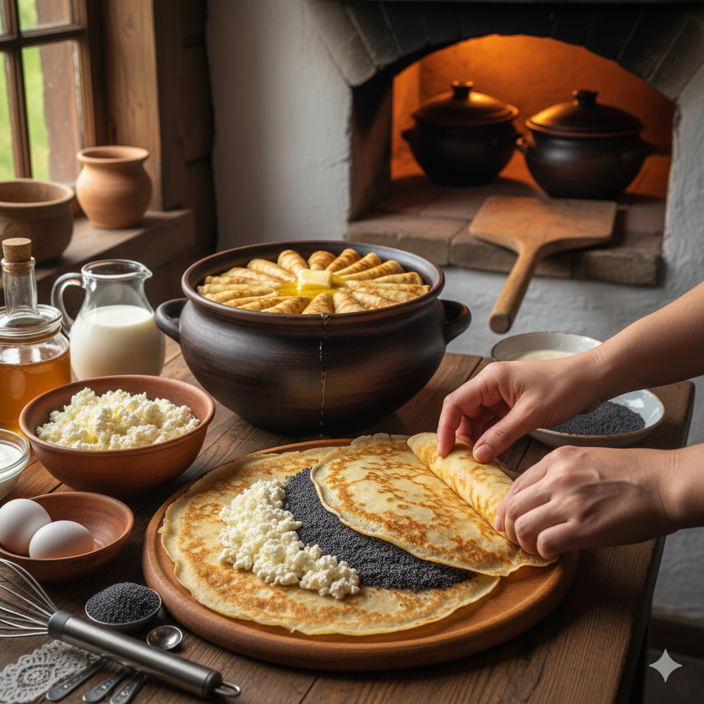 Збити 4 яєць, 1 літр молока, пів кілограма крохмалю, сіль, цукор за смаком, влити трошки олії без запаху. Смажити на олії. Далі зробити начинку – сир чи тертий мак. Скласти у макітру, залити маслом, запікати у печі або духовці.