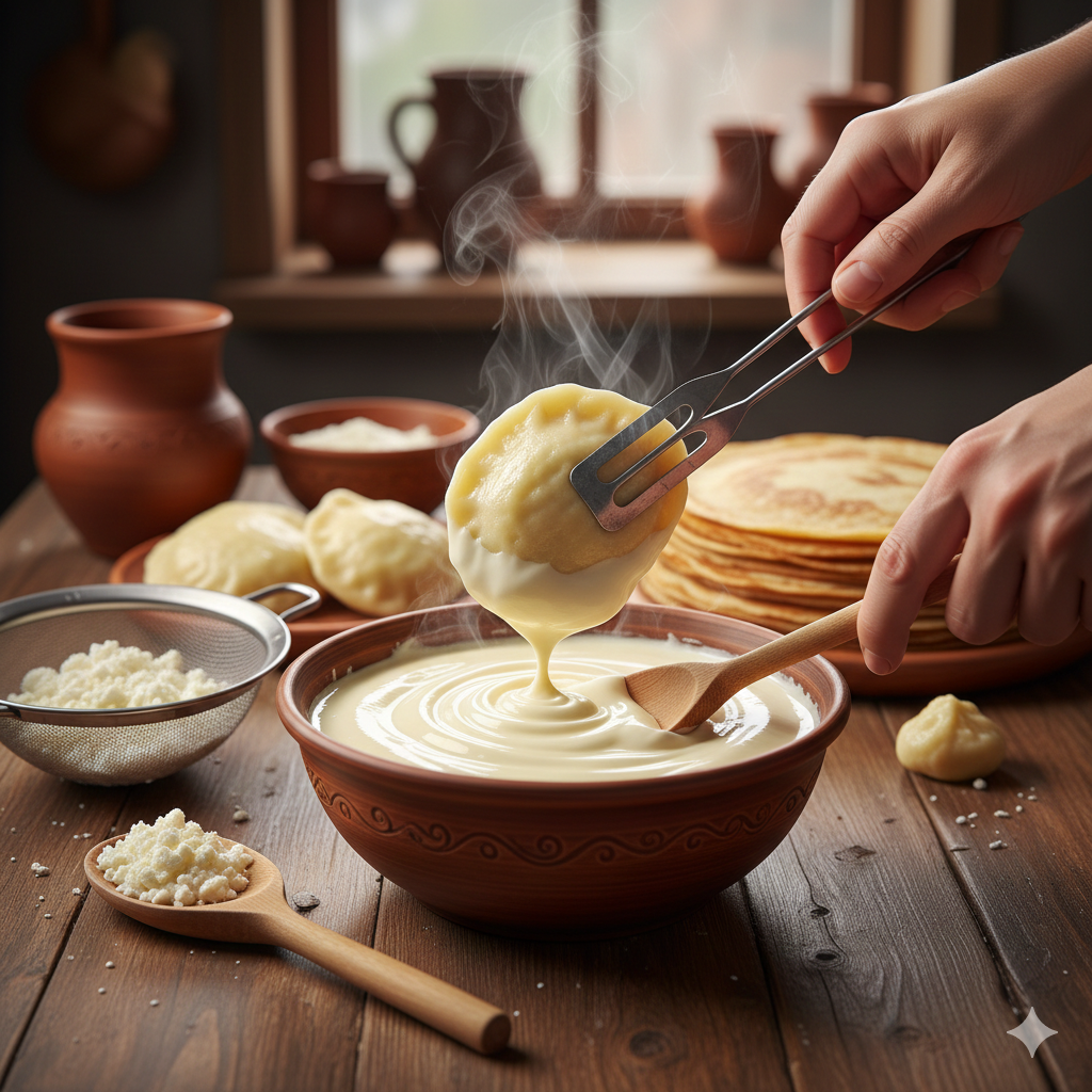 Розтирають солоний сир із водою та коров'ячим маслом, гріють і в гаряче вмочають. Зазвичай сир пропускали через сито чи друшляк, а тоді збивали його до однорідності з гарячим молоком і гарячим маслом, розтопленим на водяній бані. Цей крем подавали гарячим до вареників і млинців.