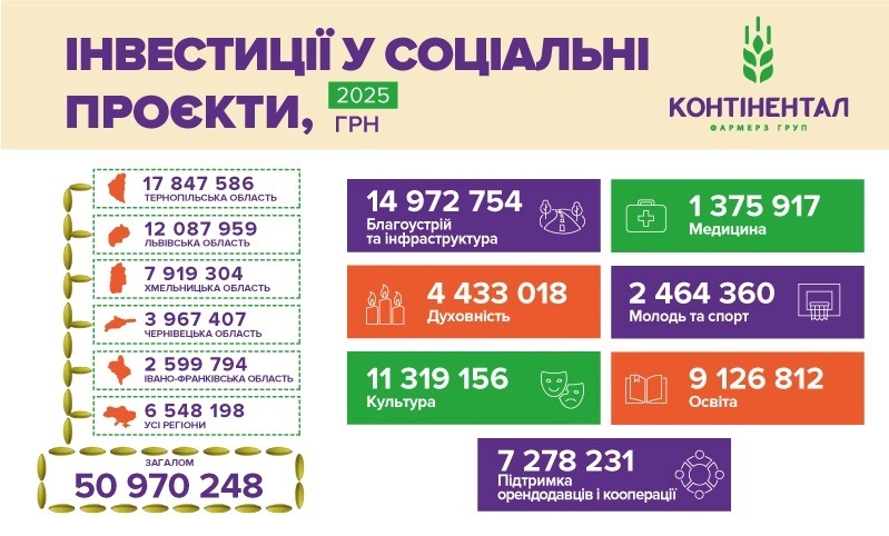 Розмір податкових відрахувань Компанії до бюджетів усіх рівнів продовжив зростати і минулоріч сягнув 1,86 млрд грн — на 239 млн грн більше, ніж у 2024 році. Водночас «Контінентал» надалі системно підтримує громади, на території яких веде свою діяльність: на втілення соціальних проєктів у п’яти західних областях України протягом 2025 року було спрямовано 50,97 млн грн.