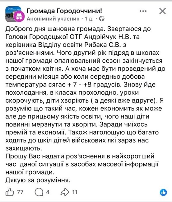 Проблему активно обговорювали у місцевих спільнотах. Зокрема, в групі «Громада Городоччини» з’явився анонімний допис із запитанням, чому опалення вимикають, незважаючи на погодні умови. У коментарях мешканці зазначали, що така ситуація повторюється не вперше — у міжсезоння в закладах освіти регулярно холодно.